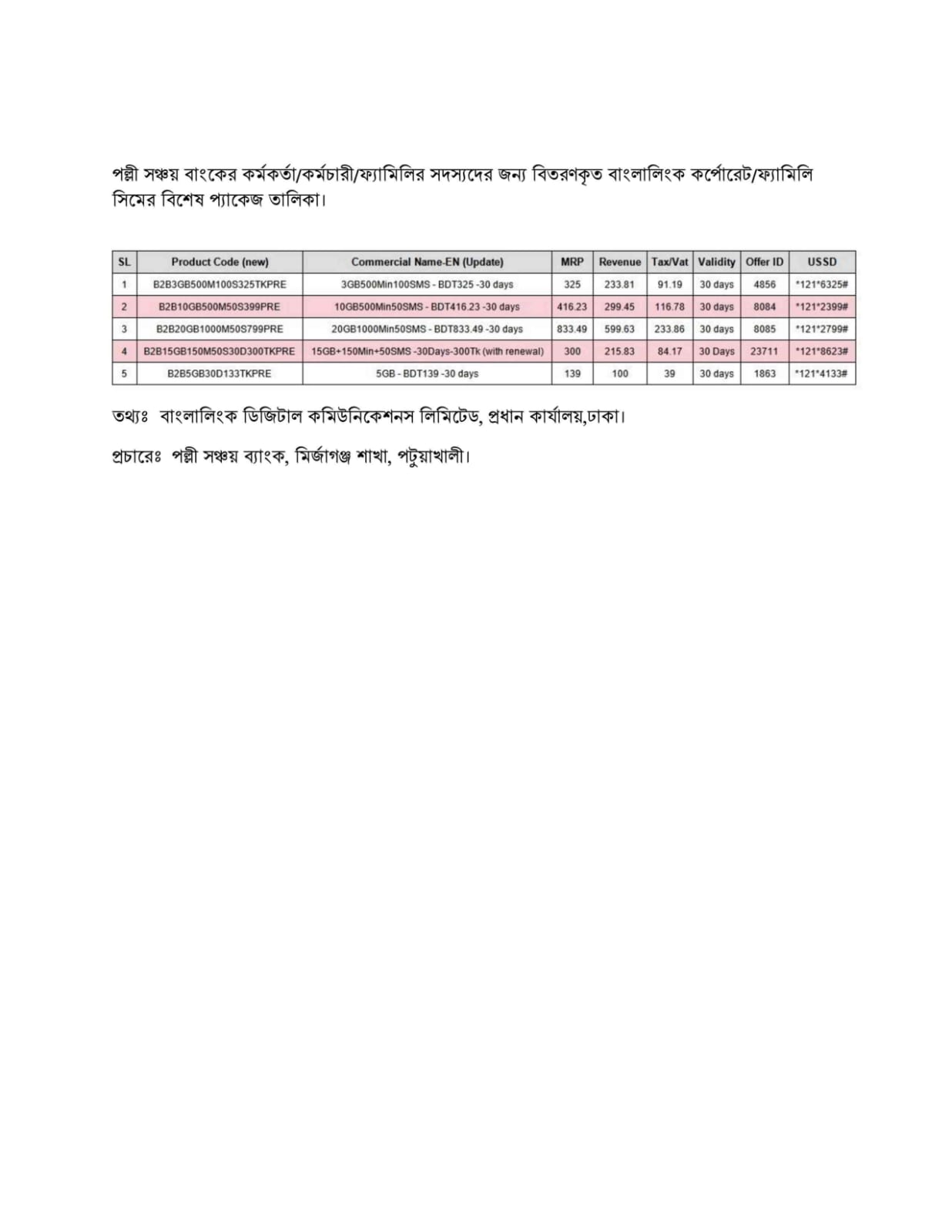 | ২ | ব্যাংক হতে পাওয়া বাংলালিংক সিমের প্যাকেজ ক্রয়ের কোডসমুহ। | | | ৩০-০৩-২০২৬ | দেখুন |